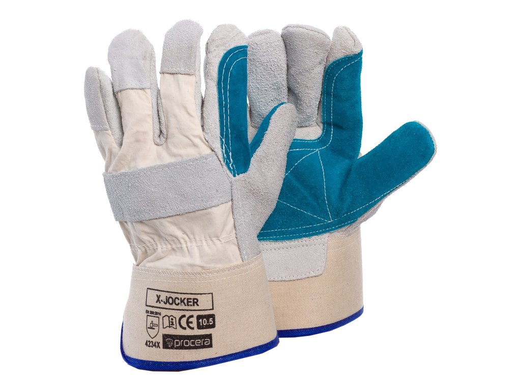 X-JOCKER rukavice z bavlněné tkaniny na hřbetové části. Úchopová část je vyrobena z kvalitní hovězí kůže v přírodní barvě. Úchopová část, ukazováček a palec jsou navíc zesíleny vrstvou hovězí štípané kůže v modré barvě. Na horní části, v linii záprstní kosti a na konečcích prstů, je navíc výztuha z hovězí štípané kůže. Manžeta je pogumovaná a olemovaná, nahoře je všitá stahovací šňůrka, která zajišťuje pohodlí a volnost při používání. Uvnitř, v úchopové části, jsou rukavice zakončeny měkkou podšívkou. Kategorie II. K dispozici ve velikosti 10,5. Balení: karton 12/72.
