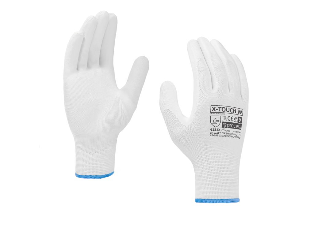 Rukavice X-TOUCH WHITE z polyesteru s polyuretanovým povrchem na úchopové části. Ideální pro manuální práci. Velmi dobrý cit pro držený předmět. Dobře se přizpůsobí tvaru ruky. Natahovací a pružné. Zakončené stahovací šňůrkou. CE EN 388. Balení: karton 12/240. Barva: bílá